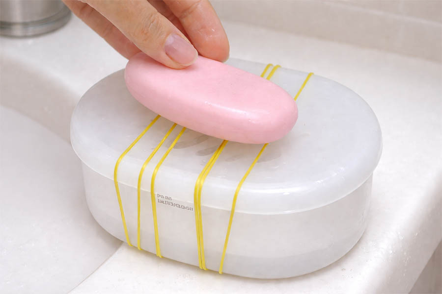 비누 받침대 위에 노란 고무줄을 여러 개 끼워주세요. 그러면 비누가 받침대 바닥에 직접 닿지 않게 되고, 물이 아래로 빠지면서 비누가 닳는 속도가 줄어듭니다. 물에 닿지 않아 미끄러짐도 덜해 사용감도 훨씬 좋아집니다.