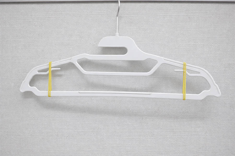 니트처럼 표면이 매끈한 옷은 옷걸이에 걸어두면 자꾸 흘러내립니다. 이럴 때 옷걸이 양쪽 끝에 노란 고무줄을 감아주면 고무줄 표면의 마찰력이 옷을 단단히 잡아줘 흘러내림을 막아줍니다. 노란 고무줄만 있으면 미끄럼 방지 옷걸이가 된답니다.