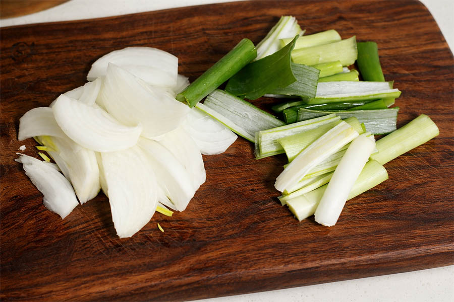 양파는 채 썰고, 대파는 어슷하게 썰어주세요.