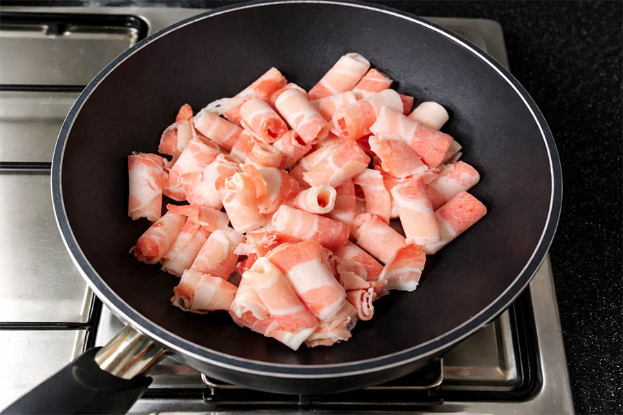 센불로 달군 팬에 대패삼겹살을 넣고 볶아주세요. 돼지기름이 충분히 나올 때까지 볶아주세요.