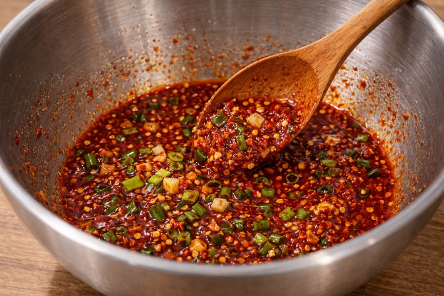 큰 볼에 고춧가루 3큰술, 진간장 2큰술, 멸치액젓 2큰술, 참치액 1큰술, 설탕 1큰술, 매실청 2~3큰술, 다진 파 2큰술, 다진 마늘 1큰술, 식초 1큰술을 넣고 잘 섞어주세요.