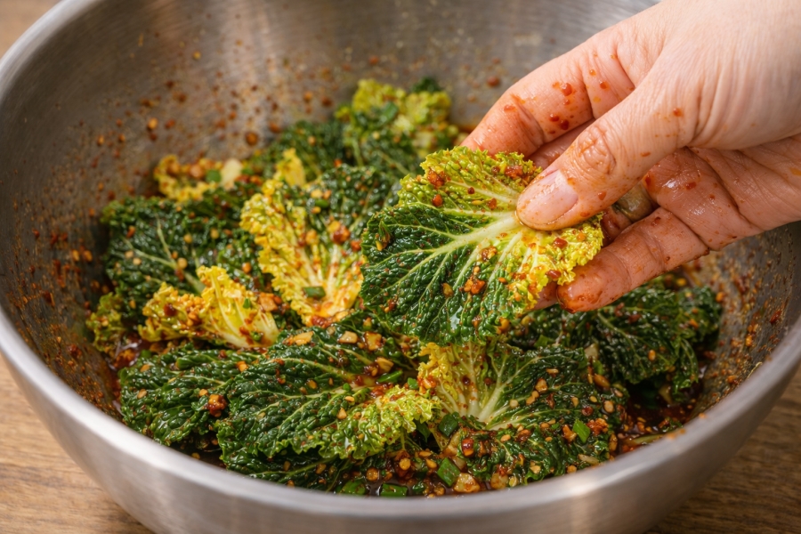 여기에 손질한 봄동을 넣고 손끝으로 가볍게 버무려줍니다. 봄동은 잎이 연한 채소라 세게 무치면 풋내가 올라오고 식감이 쉽게 죽을 수 있어요. 살살 섞듯 무쳐야 아삭한 식감이 살아납니다.
