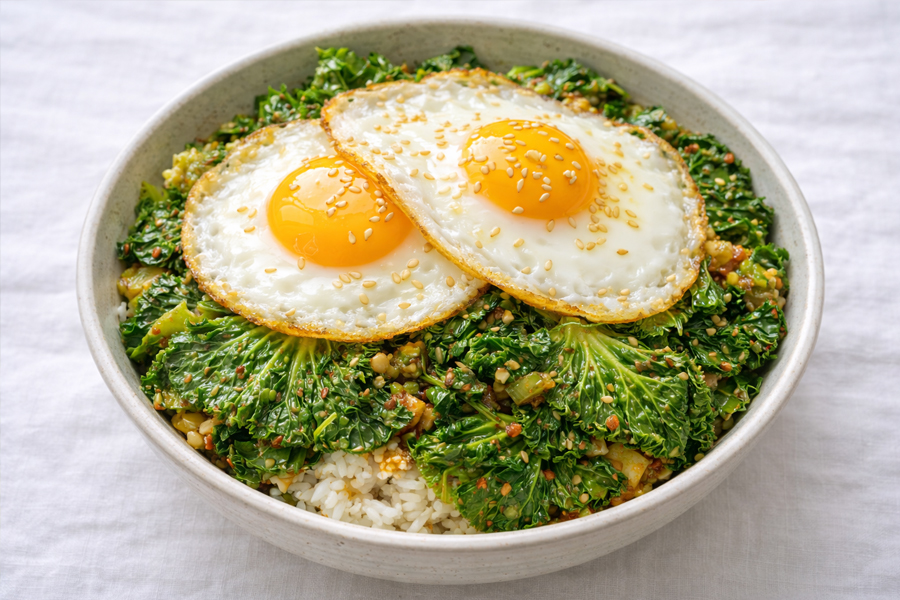 넓은 그릇에 따뜻한 밥 1공기를 담고, 무쳐둔 봄동을 넉넉하게 올려주세요. 그 위에 계란프라이를 얹고 참기름과 통깨를 솔솔 뿌리면 완성입니다.